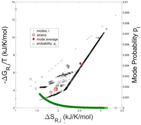 The solid diamond represents the arithmetic average of −∆Gj/T and ∆Sj taken over all modes, while the open red circles represent the entropy and Gibbs free energy of reaction computed from the experimentally determined overall growth reaction (Equation (8)) of each strain. Thermodynamic values were calculated from the experimental flux data for the externally occurring metabolites of the seven strains tested by Long [35]. Compared to the mode-average entropy and Gibbs free energy of reaction, which assumes a uniform probability distribution over all the modes, the experimentally determined thermodynamic values are clearly biased towards lower values of entropy as expected from a Boltzmann distribution of elementary modes (see Equation (28)). In addition, probability values for each elementary mode are superimposed onto the figure.