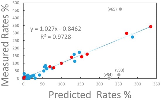 Measured vs. predicted metabolic rates for strain ALE-3. The rates of the metabolic reaction network are expressed relative to the glucose uptake rate, which has a value of 100%. The metabolic reaction network consists of 73 reaction steps of which 11 (marked with red full circles) are transport reactions into and out of the external cell environment. The remaining intracellular reactions are marked with closed blue circles. The three labeled, gray datapoints deviate significantly from the correlation between measured and predicted reaction rates. Label v65 represents the reaction rate of the conversion of intracellular ATP into the external ATP pool (see text for explanation). Label v34 represents the anabolic conversion of oxaloacetate to phosphoenolpyruvate consuming ATP. Label v33 represents the anaplerotic conversion of phosphoenolpyruvate into oxaloacetate. The linear regression represented by the dashed line, excludes the labeled datapoints.