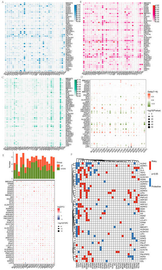 The role of GMRGs in the development of human malignant tumors has not been elucidated, so we first summarized the pan-cancer characteristics of GMRGs using data from TCGA. We found that more GMRGs, including aldehyde dehydrogenase 3 family member A2 (ALDH3A2), glycerate kinase (GLYCTK), lipoprotein lipase (LPL), and diacylglycerol kinase eta (DGKH), exhibited more CNV deletions in kidney chromophobe (KICH), ovarian serous cystadenocarcinoma (OV), and uterine carcinosarcoma (UCS) (Figure 1A). More GMRGs, including diacylglycerol kinase beta (DGKB), diacylglycerol kinase iota (DGKI), acylglycerol kinase (AGK), aldo-keto reductase family 1 member B1 (AKR1B1), and aldehyde dehydrogenase 9A1 (ALDH9A1), exhibited more CNV amplifications in adrenocortical carcinoma (ACC), KICH, OV, and UCS (Figure 1B). In addition, skin melanoma (SKCM) and endometrial cancer (UCEC) had a high number of GMRGs with SNVs, specifically 38 GMRGs in SKCM and 40 GMRGs in UCEC (Figure 1C). Considering that aberrant DNA methylation is also closely associated with tumorigenesis [45], we similarly analyzed the DNA methylation of GMRGs in different tumor types. Figure 1D shows that pancreatic lipase-related protein 1 (PNLIPRP1), pancreatic lipase (PNLIP), and DGKB presented hypomethylation in bladder urothelial carcinoma (BLCA), head and neck squamous cell carcinoma (HNSC), liver hepatocellular carcinoma (LIHC), lung squamous cell carcinoma (LUSC), and uterine corpus endometrial carcinoma (UCEC), whereas DGKI and AKR1B1 presented hypermethylation in breast invasive carcinoma (BRCA), colon adenocarcinoma (COAD), and prostate adenocarcinoma (PRAD) (−log10Pvalue ≤ 10). In addition, the expression levels of most GMRGs were different compared with those in control samples, and more GMRGs were downregulated in tumors (Figure 1E). Then, the prognostic value of GMRGs in different tumor types was investigated in depth by analyzing the gene expression levels and the survival time. It was found that most GMRGs, such as ALDH2, LPL, and DGKH, acted as protective genes (HR < 1 and p < 0.05) in renal clear cell carcinoma (KIRC), while most GMRGs acted as risk genes (HR > 1 and p < 0.05) in ACC, LUSC, uveal melanoma (UVM), and mesothelioma (MESO) (Figure 1F).