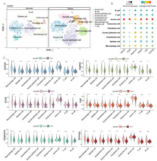 GLM characterization of PC based on scRNA-seq. (A) Annotation results for different clustered cells. (B) The bubble plot shows the GLM scores for different cell types. (C) The violin charts show the GLM scores based on different methods (ns, non-significant, * p < 0.05, ** p < 0.01, *** p < 0.001, and **** p < 0.0001).