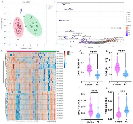 Characterization of the GLM landscape of PC based on lipidomic analysis. (A) sPLS-DA analysis of the overall sample. Green dots represent PC samples, red dots represent control samples, and blue dots represent QC samples. (B) Differential analysis of glycerolipid-related metabolites between PC and control samples. (C) A heatmap of glycerolipid-related metabolites. (D–G) The expression levels of four significantly different metabolites (*** p < 0.001; **** p < 0.0001).