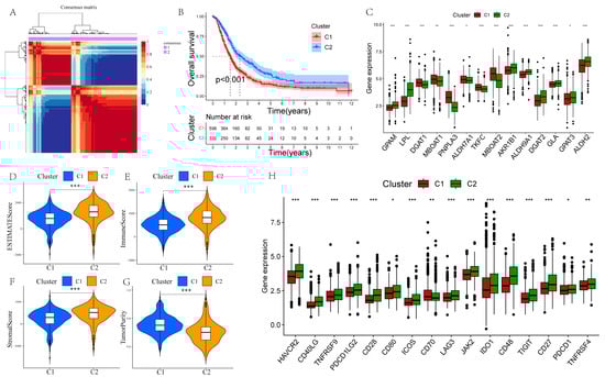 NMF clustering identification of two molecular subtypes in PC. (A) The ideal number for clustering is 2. (B) Prognostic analysis of the two subtypes. (C) Differential expression analysis of GMRGs. (D–G) Estimatescore, immunescore, stromalscore, and tumor purity are compared between the two subtypes. (H) The differences between the two subtypes in terms of ICG expression (* p < 0.05, ** p < 0.01, and *** p < 0.001).
