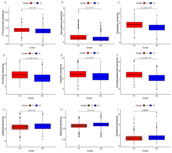 The plots show the estimated IC50 of chemotherapeutic drugs for the two subtypes. (A–I) 5-Fluorouracil, gemcitabine, oxaliplatin, irinotecan, cisplatin, cyclophosphamide, lapatinib, sapitinib, and trametinib.