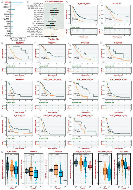 The identification of the key prognostic GMRG in PC. (A) RF-based identification of key GMRGs. (B) Cox regression analysis of ALDH2 in several PC datasets. (C–P) Kaplan–Meier analyses (OS and RFS) of ALDH2 in several PC datasets. (Q) Analysis of the correlation between ALDH2 and the PC tumor grade. * p < 0.05, ** p < 0.01, *** p < 0.001, and **** p < 0.0001.