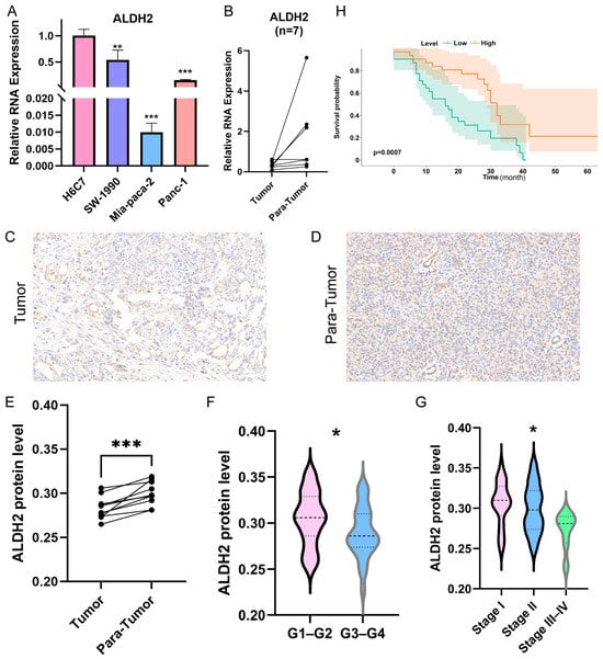 Cell lines and clinical cohort validation of ALDH2. (A) The mRNA expression levels of ALDH2 in H6C7 and three PC cell lines. (B) The mRNA expression levels of ALDH2 in clinical tissues. (C,D) Immunohistochemical images of tumor and para-tumor tissues. (E) The protein levels of ALDH2 in 10 pairs of PC and para-tumor tissues. (F) The protein levels of ALDH2 between pathological grade 1–2 and pathological grade 3–4 PC tissues. (G) The protein levels of ALDH2 among stage I, stage II, and stage III–IV PC tissues. (H) Survival curves of PC patients in the high- and low-ALDH2-expression groups (* p < 0.05, ** p < 0.01, and *** p < 0.001).