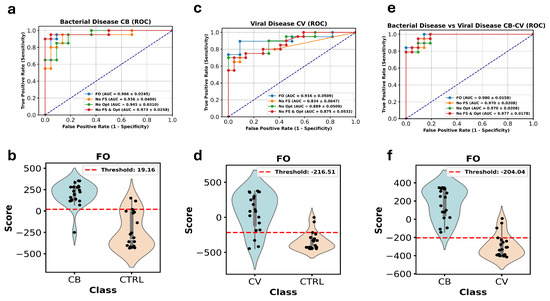 Furthermore, in Figure 1b,d,f, violin plots are shown for the FO ensemble model scores across the two classes for each dataset (CB, CV, and CB-CV). These plots illustrate the distribution of classification scores between the “Case” and “Control” groups, highlighting the quantitative differences and demonstrating the model’s discriminative power. The clear separation between the two classes, particularly in the CB-CV models, emphasizes the strong classification performance of our ensemble model.