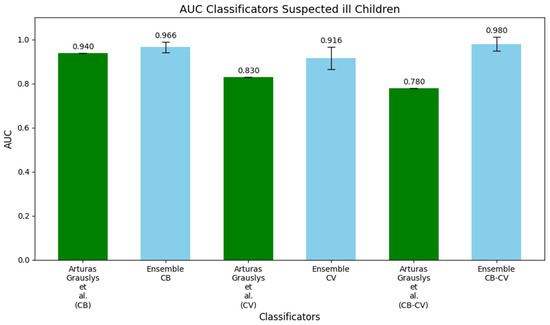 The first pair of histograms compares the AUC values for the CB dataset, where the original model developed by Grauslys et al. [12] achieved an AUC of 0.940, while our DW-EML outperformed it with an AUC of 0.966. In the second pair, focusing on the CV dataset, their model reached an AUC of 0.830, whereas our model achieved a significantly higher AUC of 0.916, demonstrating the effectiveness of our approach in this context. Finally, the third pair highlights the largest difference in the CB-CV dataset, where the original model obtained an AUC of 0.780, while the DW-EML model achieved a notably higher AUC of 0.980, indicating a substantial improvement in distinguishing between bacterial and viral infections.