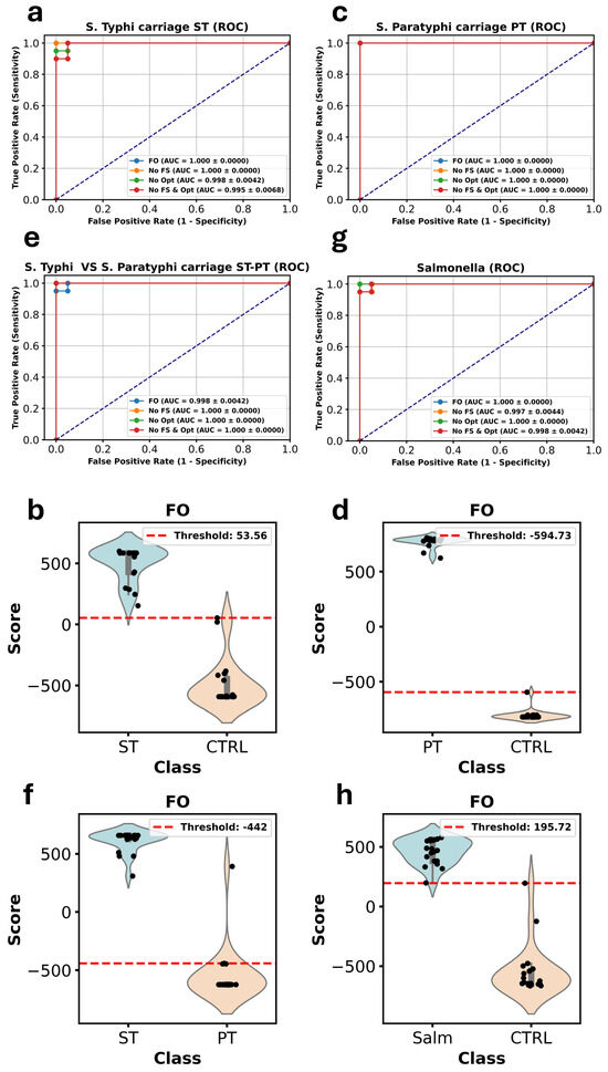 In the PT models, the fully optimized configuration also yielded an accuracy of 100%, and this remained stable regardless of whether FS or Opt was applied. This suggests that the model was able to distinguish between Salmonella Paratyphi and controls with high reliability under all configurations.