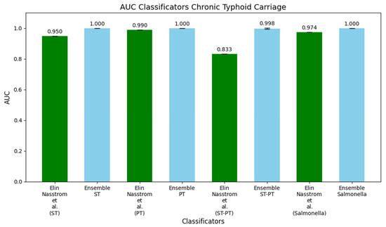 Finally, in Figure 4, we display histograms comparing the AUC values of DW-EML models trained using the FO setup with those reported by Nasstrom et al. (2018) [13]. The first pair of histograms contrasts their ST model, which achieved an AUC of 0.950, with the DW-EML model, which reached a perfect AUC of 1. The second pair compares their PT model, with an AUC of 0.990, against the DW-EML, which also achieved an AUC of 1. The third pair illustrates the ST-PT model, for which their original model had an AUC of 0.833, while the DW-EML performed significantly better with an AUC of 0.998. The final pair compares their Salmonella model, which had an AUC of 0.974, to the DW-EML model’s AUC of 1, further showcasing the performance improvements offered by our ensemble approach.