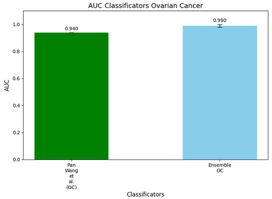 Histogram comparing the AUC values of the ensemble machine learning model trained using the classic setup with the AUC reported by Wang et al. [14] for the OC dataset. Their model achieved an AUC of 0.940, while our ensemble model, incorporating feature selection and hyperparameter optimization, significantly outperformed it with an AUC of 0.990, highlighting the improvements in predictive performance offered by the ensemble approach.
