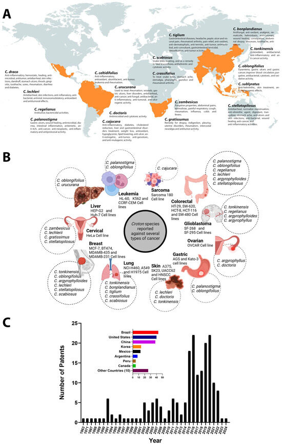 Traditional uses of and patents for Croton species worldwide. (A) Geographical distribution of scientific publications detailing ethnopharmacological applications by country. (B) Summary of cancer cell lines reported in Croton antiproliferative assays. (C) Patents protecting biotechnological and pharmacological uses of Croton species reported in the last 61 years. Diagrams created with BioRender.