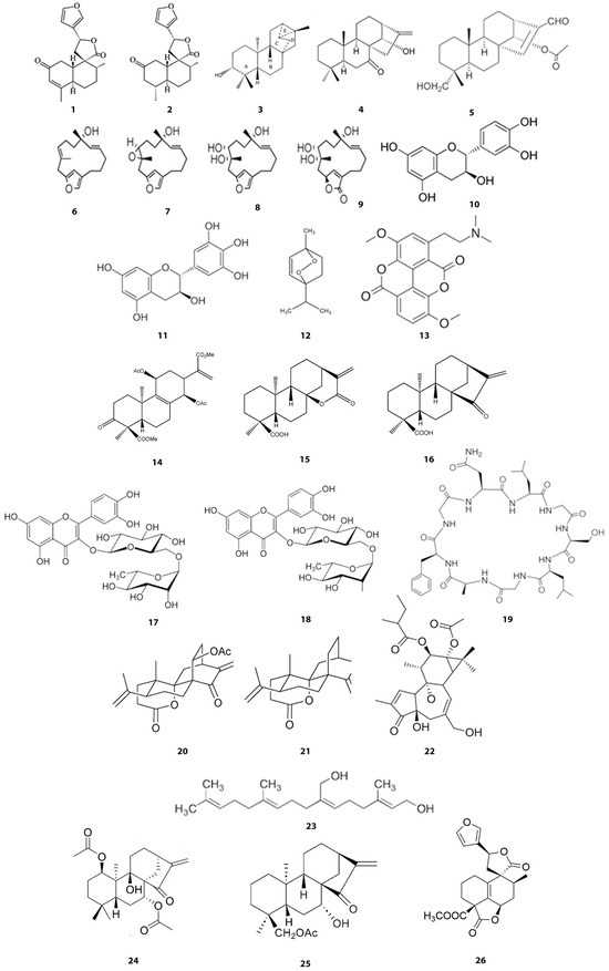 Chemical structures of SMs with reported cell cycle-related targets that have been identified in Croton species: (1) Trans-dehidrocrotonin, (2) Trans-crotonin, (3) Ent-trachyloban-3,-ol, (4) Crotonquinin A, (5) Crotonquinin B, (6–9) Furanocembranoids 1-4, (10) Catechin, (11) Galocatechin, (12) Ascaridol, (13) Taspine, (14–16) Ent-kaurene 1-3, (17) Rutin, (18) Vitexin, (19) Crourorb A1, (20) Crotobarin, (21) Crotogoudin, (22) B10G5, (23) Plaunotol, (24) Ent-kaurane I, (25) NCKU_PCKuo_0001, and (26) Chettaphanin II.