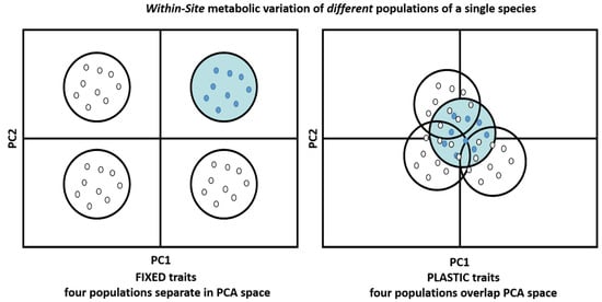 Hypothetical principal component analysis score scatter plots showing clustering of individual plant samples based on the metabolic phenotype profiles obtained from plants in a reciprocal transplant or common garden study. In this case, plants from four separate geographic populations were all grown within the same native location of one of the populations (this measures within-site variation). The native population location is termed “home” and the “away” populations are those plants introduced from another geographic population to the home location. In reciprocal transplant and common-garden studies, the within-site metabolic variation between the four different populations grown can be considered fixed if the metabolic traits of the away population (white, open) remain separate and dissimilar to the home population (blue) and plastic if clustered together and similar to the home population.