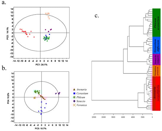 We found strong evidence of interspecific separation of species in metabolic space. Masses detected within the aqueous phase analysed in positive ionisation mode showed clear clustering of each species (Figure 2a,b). PCA scores plots indicate that V. arvensis and A. serpyllifolia samples both clustered away from other species along PC2 and PC1, respectively (Figure 2a). Senecio vulgaris and C. diffusum clustered along PC3 and PC4, respectively, while P. arenarium clustered between these two components (Figure 2b). Using the same binned dataset, a dendrogram can be built (Euclidean distance) on the combined eigenvalues of the samples in PC1 to PC4 to measure the similarity and relatedness of each species (Figure 2c). In common with Figure 2a, P. arenarium and C. diffusum were within the same node (Figure 2a) with A. serpyllifolia behaving as an outgroup to all the other species.