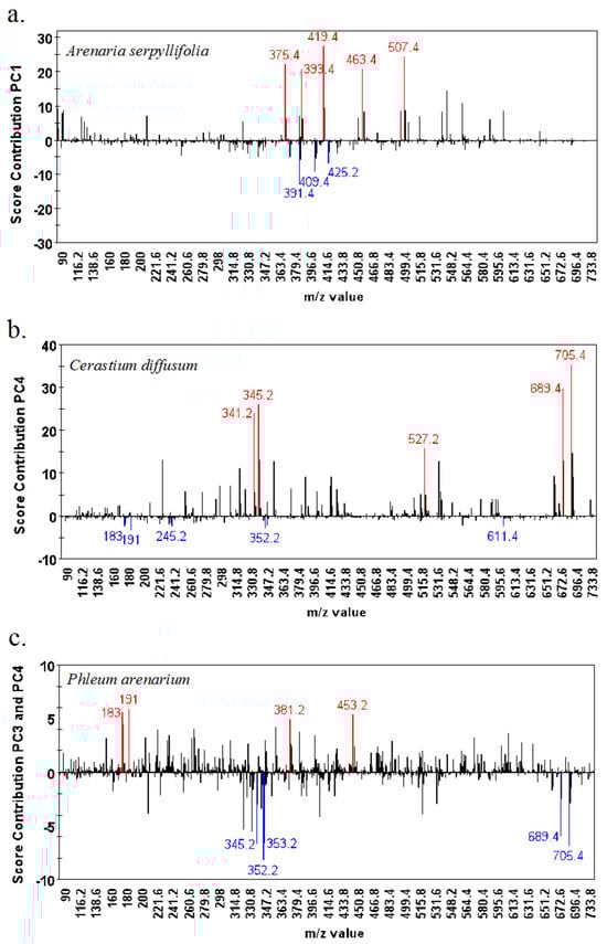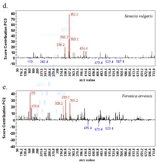 The scores contribution plots (that correspond directly to the PCA plots shown in Figure 2) indicate which mass bins are in high abundance (more positive) and low abundance (more negative) for each species in relation to all other species analysed (Figure 3a–e). Each species has a unique metabolic phenotype in that the composition of the main discriminating mass bins are different for each species. For example, C. diffusum and A. serpyllifolia samples have high abundances of masses in the high range (>300 m/z) (Figure 3a,b); P. arenarium and V. arvensis are typified by large quantities of low-mid range masses (between 150 and 200 m/z) (Figure 3c,e), while the mass bin 352.2 is found to highly discriminate S. vulgaris (Figure 3d).