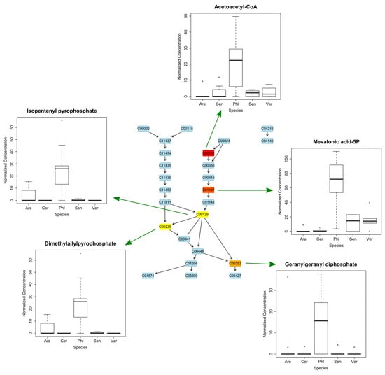 An example of metabolic mapping pathway analysis using Metaboanalyst (http://www.metaboanalyst.ca/). Pathway of terpenoid backbone metabolism, putatively identified metabolites highlighted from yellow to red were found to be significantly higher in abundance in Phleum arenarium (Phl) compared to the other sand dune species. Dots indicate outliers in the dataset.