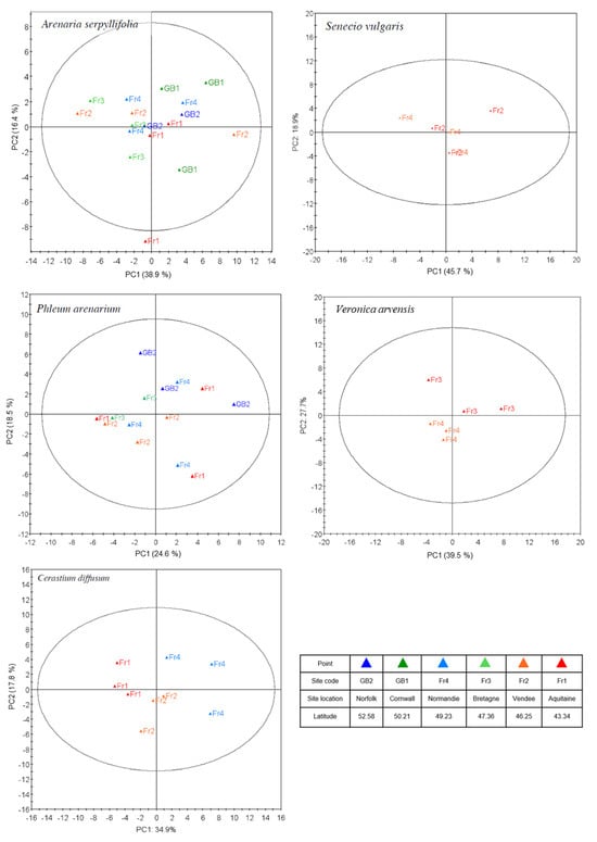 Intra-specific metabolic phenotype variation. Score scatter plots from principal component analysis of m/z values (binned to 0.2 Da) obtained by metabolic fingerprinting populations of five species grown under identical conditions in controlled environment cabinets, A. serpyllifolia, P. arenarium, S. vulgaris, V. arvensis, and C. diffusum. Legend provides location information for each population of origin. Percentage of the variation in the data explained by each component is provided. n = 3 per population.