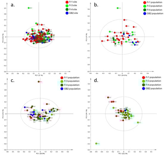 Score scatter plots from principal component analysis of m/z values (binned to 0.2 Da) obtained by metabolic fingerprinting V. arvensis from the reciprocal transplant study between GB1, GB2, and Fr2 sites. (a) Between-site variation PCA of all reciprocal transplant data (coloured according to plant site origin and labelled according to plant growth location); (b) within-site variation in V. arvensis from Fr1, Fr3, Fr4, GB2 growing in site Fr1; (c) within-site variation in V. arvensis from Fr1, Fr3, Fr4, GB2 growing in site GB1; (d) within-site variation in V. arvensis from Fr1, Fr3, Fr4, GB2 growing in site GB2. Figure 6b–d are coloured and labelled according to plant site origin.