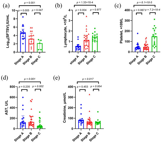 Clinical characteristics of survival cases in the discovery set. Comparison of SFTSV load (a), lymphocyte counts (b), platelet counts (c), AST (d) and (e) creatinine levels among three Stages are shown. p values were calculated using two-sided Mann–Whitney U test. Abbreviations: AST, aspartate aminotransferase.