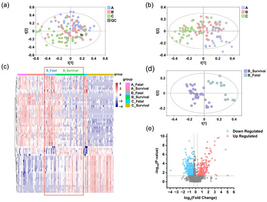 Based on the results from the exploratory analysis of the groups, we focused on the metabolic differences between the survival and fatal cases, examining how significant differential metabolites changed during disease progression. We selected differential metabolites between the survival and fatal groups at stage B. Applying the criteria of VIP values > 1.0 from the PLS-DA model and the multiple criteria of FC > 1.2 and p < 0.05 from the volcano plot, we identified 413 significantly altered metabolites. Specifically, 199 and 214 metabolites showed significant changes in positive and negative ion modes, respectively. Among the significantly changed metabolites, 170 were upregulated (53 from the positive ion mode and 117 from the negative ion mode), and 243 were downregulated (146 from the positive ion mode and 97 from the negative ion mode).