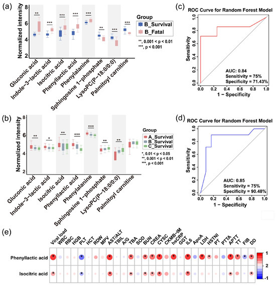 Based on significant differences in metabolite profiles, we developed a prognostic model for the severity of SFTS. Through rigorous screening, phenyllactic acid and isocitric acid were identified as key predictor metabolites, demonstrating an impressive area under the curve (AUC) of 0.85 in a random forest model applied to the test set. This model exhibited a sensitivity of 75% and specificity of 90% (Figure 6c), surpassing other combinations of metabolites. These two metabolites were found to exhibit abnormal elevation in SFTS patients, with a more pronounced effect observed in those who succumbed (Figure 6a), indicating a close association with the metabolic state following viral infection. Due to their ease of detection and strong potential for clinical application, phenyllactic acid and isocitric acid serve as valuable references for early intervention and prognostic evaluation.
