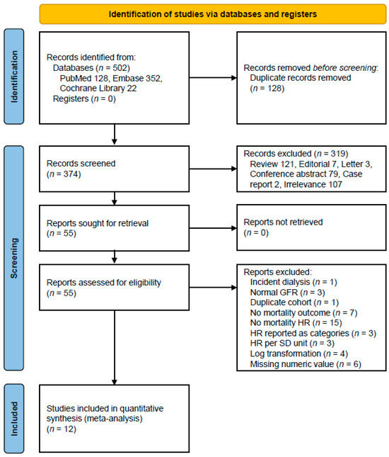 Our systematic database search identified 502 potentially relevant articles across multiple databases: PubMed (n = 128), Embase (n = 352), and Cochrane Library (n = 22). After removing 128 duplicate records, we screened 374 unique abstracts. Following the initial screening, 55 articles were retrieved for full-text assessment. Of these, 12 studies met our inclusion criteria [14,15,16,21,28,32,33,34,35,36,37,38], comprising a total study population of 2523 subjects. The detailed study selection process is illustrated in Figure 1.