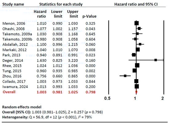 A forest plot of meta-analysis. Adiponectin (per 1 µg/mL increment) and risk of all-cause mortality in patients with chronic kidney disease. Studies included: Menon, 2006 [32]; Ohashi, 2008 [14]; Takemoto, 2009a [28]; Takemoto, 2009b [28]; Abdallah, 2012 [33]; Markaki, 2012 [15]; Park, 2013 [16]; Deger, 2014 [34]; Rhee, 2015 [21]; Tung, 2015 [35]; Zhou, 2016 [36]; Collado, 2017 [37]; Iwamura, 2024 [38]. Abbreviations: CI, confidence interval; df, degrees of freedom.