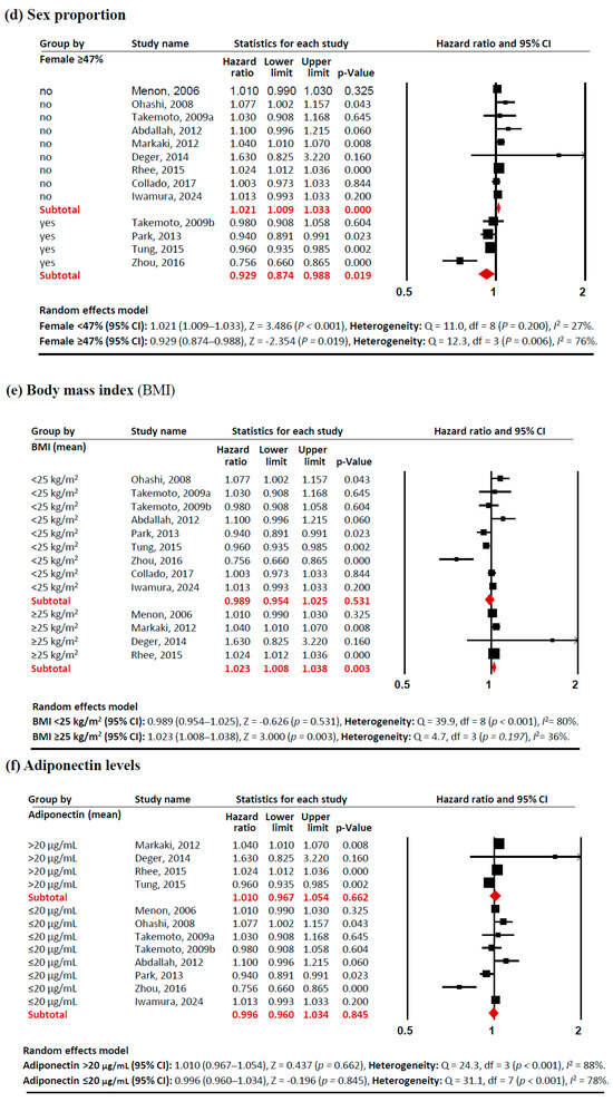 Forest plots of subgroup meta-analysis. Adiponectin (per 1 µg/mL increment) and risk of all-cause mortality in patients with chronic kidney disease. (a) study site (Asia, non-Asia), (b) dialysis modality (HD, PD), (c) age (<55 years old, ≥55 years old), (d)sex proportion (<47% vs. ≥47% female), (e) BMI (<25 kg/m2, ≥25 kg/m2), and (f) adiponectin levels (>20 µg/mL, ≤20 µg/mL). Studies included: Menon, 2006 [32]; Ohashi, 2008 [14]; Takemoto, 2009a [28]; Takemoto, 2009b [28]; Abdallah, 2012 [33]; Markaki, 2012 [15]; Park, 2013 [16]; Deger, 2014 [34]; Rhee, 2015 [21]; Tung, 2015 [35]; Zhou, 2016 [36]; Collado, 2017 [37]; Iwamura, 2024 [38]. Abbreviations: CI, confidence interval; df, degrees of freedom.