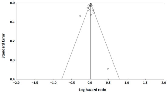 The funnel plot (Figure 4) showed symmetric distribution of studies examining adiponectin levels and all-cause mortality. Both Begg’s test (p = 0.214) and Egger’s test (p = 0.237) confirmed no significant publication bias, supporting the robustness of our findings.
