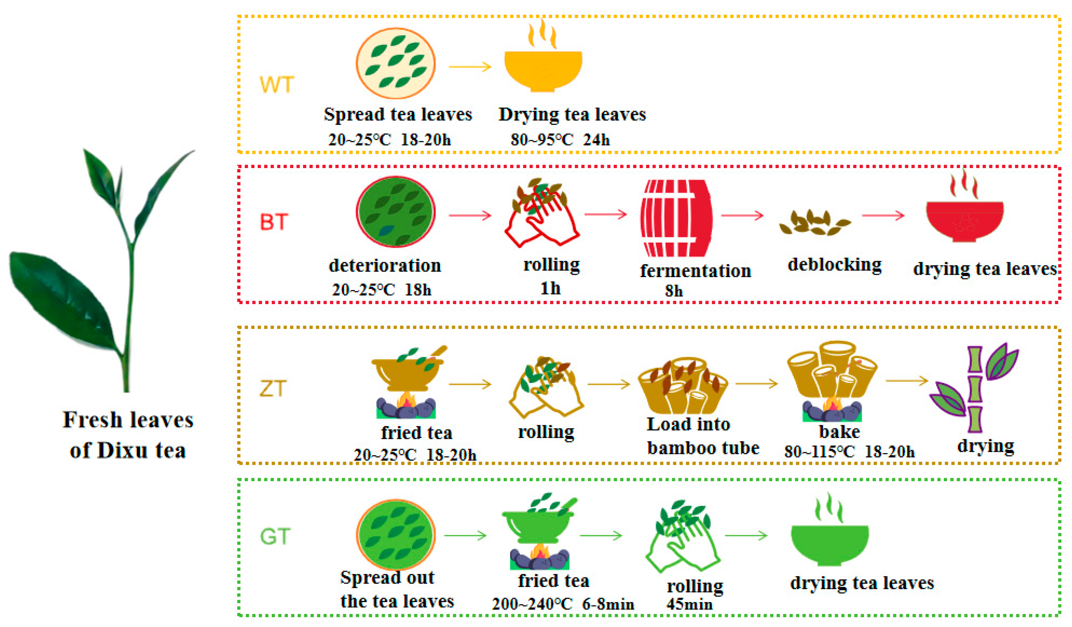 - Tang, R.; Luo, Y.J.; Qu, J.; Lan, Z.Q.; Tao, Y.L. Study on the suitability of different tea types of ancient tea tree processing in Xinping County. J. Food Saf. Qual. Test. 2024, 15, 130–137. [Google Scholar] [CrossRef]