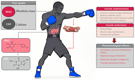 As competitive sports continue to strive for improved performance, the scientific community is increasingly exploring effective strategies to optimize athletic performance and promote physiological adaptations [1,2]. In this context, natural supplements have gained widespread attention due to their potential in enhancing athletic abilities. Among these, Rhodiola rosea (RHO) and caffeine (CAF) have become research hotspots in sports nutrition, due to their significant effects on muscle endurance, explosive power, and delay of fatigue [3].