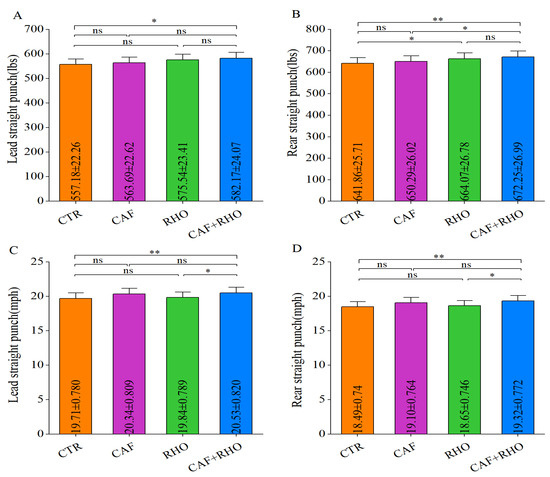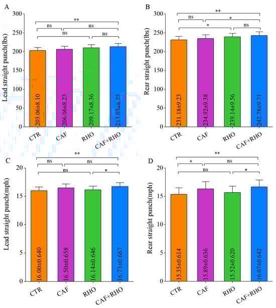 Exercise performance results of untrained volunteers. (A) Lead straight punch (lbs). (B) Rear straight punch (lbs). (C) Lead straight punch (mph). (D) Rear straight punch (mph). * p < 0.05, ** p < 0.01, ns = not significant (p ≥ 0.05).