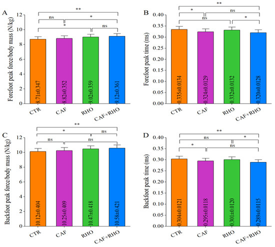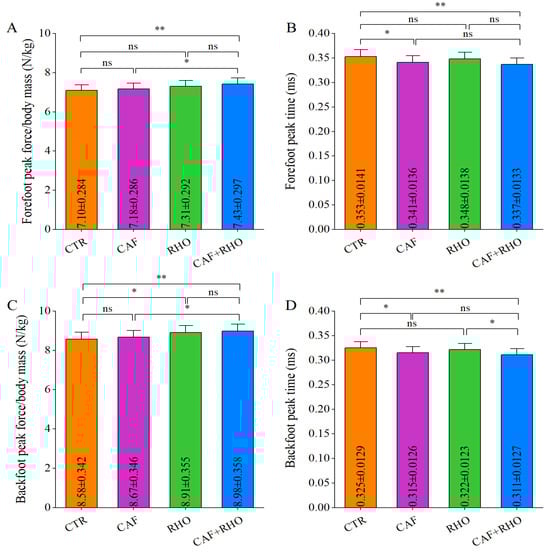 The ground reaction forces of the rear jab punches from untrained volunteers. (A) Relative peak force of the forefoot (peak force/body mass). (B) Forefoot peak force time. (C) Relative peak force of the backfoot (peak force/body mass). (D) Backfoot peak force time. * p < 0.05, ** p < 0.01, ns = not significant (p ≥ 0.05).