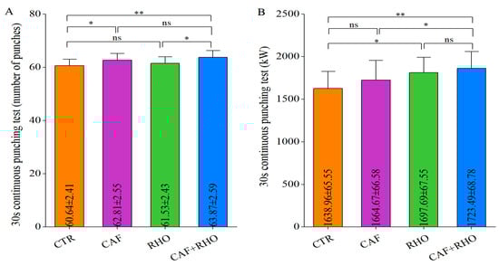 Exercise performance results of trained volunteers. (A) The 30 s continuous punching test (number of punches). (B) The 30 s continuous punching test (kW). * p < 0.05, ** p < 0.01, ns = not significant (p ≥ 0.05).
