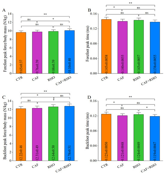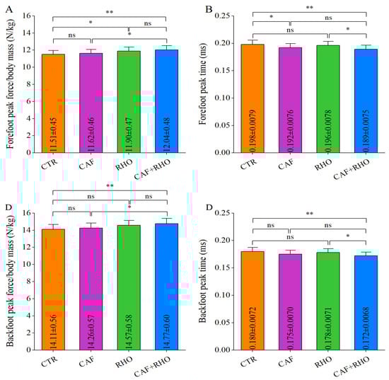 In the rear straight punch test, the forefoot peak force in the CTR group was 8.71 N/kg (Figure 9A), with a peak force time of 0.335 ms (Figure 9B). The backfoot peak force was 10.12 N/kg (Figure 9C), with a peak force time of 0.304 ms (Figure 9D). The results indicated that the CAF+RHO group exhibited significantly greater forefoot peak force than both the CAF group (p < 0.05) and the CTR group (p < 0.01), while also demonstrating a significantly shorter forefoot peak force time compared to the RHO group (p < 0.05) and the CTR group (p < 0.01). In the backfoot test, the CAF+RHO group exhibited significantly greater peak force than the CTR group (p < 0.01), along with a significantly shorter peak force time compared to both the RHO group (p < 0.05) and the CTR group (p < 0.01). Notably, 8 weeks of RHO supplementation and acute CAF intake independently improved lower-limb explosive performance to varying degrees, whereas their combined intervention elicited a significant synergistic effect, optimizing lower-limb force generation.