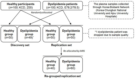 This study was designed as a cross-sectional, two-phase approach comprising a biomarker discovery stage (discovery) and an independent validation stage (replication). As illustrated in Figure 1, each of the two groups (healthy and dyslipidemia; n = 100 each) was further randomly divided into a discovery set and a replication set in a 1:1 ratio. This sample size was determined using G*Power ver. 3.1.9.7 (Franz Faul, University of Kiel, Kiel, Germany), which achieved a statistical power of 0.8 with an α error probability of 0.05 and an effect size exceeding 0.5.