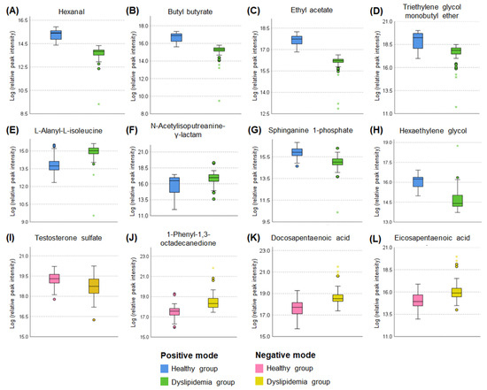 In the ESI positive mode, levels of six metabolites (hexanal, butyl butyrate, ethyl acetate, triethylene glycol monobutyl ether, sphinganine 1-phosphate, and hexaethylene glycol) were decreased, while levels of two metabolites (L-alanyl-L-isoleucine and N-acetylisoputreanine-γ-lactam) were increased in the dyslipidemia group compared to the healthy group (Figure 3A–H). In the ESI negative mode, one metabolite (testosterone sulfate) showed a lower level, whereas three metabolites [1-phenyl-1,3-octadecanedione, docosapentaenoic acid (DPA), and eicosapentaenoic acid (EPA)] exhibited higher levels in the dyslipidemia group than in the healthy group (Figure 3I–L).