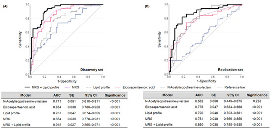 These models were locked down and applied to the replication set to verify whether their assessment ability remained intact. Unfortunately, the assessment ability of the MRS decreased by about 3% compared to that of the lipid profile, although statistical significance remained (Figure 4B). This might be attributed to the reduced assessment ability of N-acetylisoputreanine-γ-lactam (56.2%) (Figure 4B). In other words, this metabolite was not effectively applicable for use in the other independent population. Nevertheless, EPA exhibited sufficient assessment ability for dyslipidemia, and the combination model (MRS + lipid profile) was validated as having enhanced assessment ability compared to the conventional model (lipid profile) (Figure 4B). These results may emphasize the role of MRS as an assistant tool for dyslipidemia diagnostics.