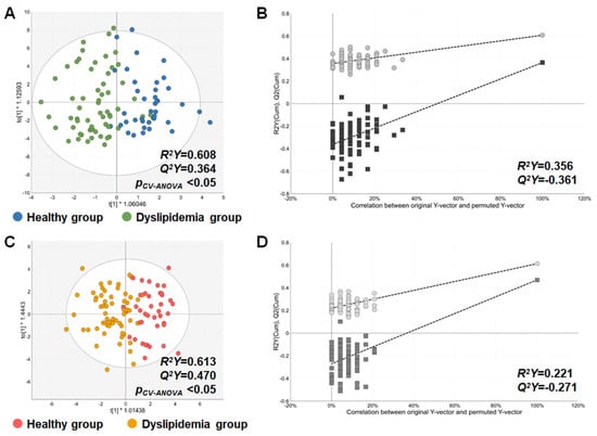 OPLS-DA and permutation test plots of the positive and negative modes in the re-grouped replication set based on the MRS. The individuals in the replication set were re-assigned into the healthy and dyslipidemia groups divided according to the MRS computed by the equation established from the discovery set; the healthy group was MRS < [MRS]median, and the dyslipidemia group was MRS ≥ [MRS]median. (A,B) OPLS-DA and permutation test plots in the positive modes, respectively. (C,D) OPLS-DA and permutation test plots in the negative modes, respectively.
