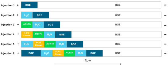 A hydrodynamic “sandwich” injection mode was employed, which involves, in sequence, the injection of BGE (50 mBar, 10 s), water (20 mBar, 5 s), acetylcholinesterase enzyme and DTNB solution (50 mbar, 5 s), followed by the acetylthiocholine substrate solution (eventually with neostigmine as the positive control or natural extracts for the inhibition studies) (50 mBar, 5 s), water (20 mBar, 5 s) and finally BGE (50 mBar, 10 s). The injection end of the capillary is rinsed with water between the enzyme and substrate injections to avoid contamination (0 mBar, 5 s). The choice to begin and end the injection with water is necessary to create a reaction environment suitable for the enzyme activity. The injection diagram in reported in Figure 1.