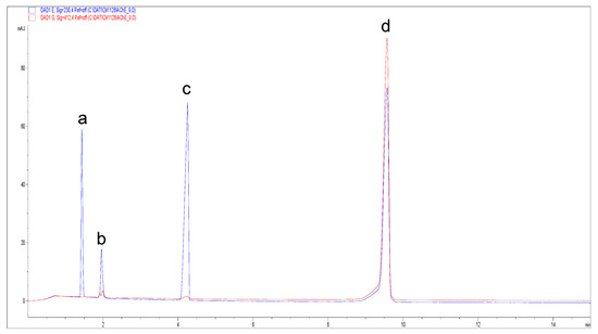 Electropherograms from the AChE reaction detected at 230 nm (blue trace) and 412 nm (red trace). The reaction was carried out using 10 mM AThCh and 5 U/mL AChE in presence of 3.33 mM Ellman’s reagent (DTNB). Background electrolyte (BGE): 30 mM borate-phosphate (pH 8.0). Capillary electrophoresis (CE) operational conditions: voltage 30 kV; wavelengths 230 nm and 412 nm; temperature 37 °C. Ordered multiple injection: 50 mBar at 10 s (BGE); 20 mBar at 5 s (water); 50 mBar at 5 s (AChE 5 U/mL); 0 mBar at 5 s (water); 50 mBar at 5 s (AThCh); 20 mBar at 5 s (water); 50 mBar at 10 s (BGE). Capillary dimension: I.D. 50 μm, 40.0 cm of effective length, and 48.5 cm total length. Peak assignment: peak (a) substrate AChTh, peak (b) adduct formed from the reaction between TNB and Ach, peak (c) unreacted Ellman’s reagent, peak (d) TNB.