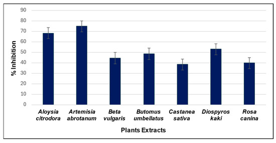 As can be seen in Figure 5, all the analysed extracts showed an inhibitory effect against AChE. The most promising results were obtained from reactions performed in the presence of A. citriodora and A. abrotanum, which exhibited a stronger inhibitory effect compared to the other extracts.
