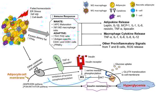 Mechanism of both systemic inflammation and insulin resistance triggered by visceral obesity. An overload of lipids leads to the expansion of adipocytes in obese visceral adipose tissue. Excess lipids cause adipocyte dysfunction, and the adipose tissue can then no longer maintain homeostasis causing endoplasmic reticulum (ER) stress and increased expression of inflammatory signals, such as nuclear factor kappa β (NF-kβ), resulting in adipocyte death. Necrotic adipose tissue attracts macrophages and other immune cells (B cells, T cells, antigen-presenting cells [APCs]). Prolonged overnutrition and excess dietary fat promote free fatty acid release from adipose tissue, in turn activating the innate and adaptive immune responses. This immune activation manifests as chronic low-grade inflammation. Adipose tissue inflammation significantly elevates the levels of pro-inflammatory adipokines, macrophage cytokines, and other pro-inflammatory signals such as reactive oxygen species (ROS). This results in interference with insulin signaling, disrupting the cellular localization and phosphorylation state of constituents. TNF-α activation of the TNF-α receptor and other cytokines/adipokines inhibit tyrosine autophosphorylation and lead to phosphorylation of serine residues on insulin receptor substrate (IRS) proteins. When serine residues on the IRS are phosphorylated, protein kinases such as protein kinase B (AKT) are blocked, causing decreased glucose uptake via the glucose transporter type 4 (GLUT4). Additionally, there is disrupted downstream insulin signaling via the mitogen-activated protein kinase/extracellular signal-regulated kinase (MAPK/ERK) and phosphoinositide 3-kinase/protein kinase B/mammalian target of rapamycin (PI3K/AKT/mTOR) pathways also contributing to insulin resistance. The subsequent hyperglycemia may further amplify the inflammatory response as well and add to the ongoing systemic inflammation. Additional abbreviations: IL—interleukin; MCP-1—monocyte chemoattractant protein-1; PPARγ—peroxisome proliferator-activated receptorγ; ↑—increased; ↓—decreased.