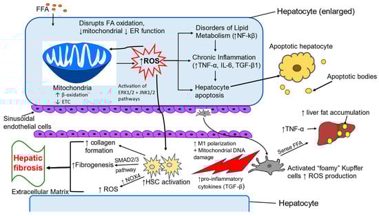 Lipotoxicity in the liver and the mechanism of progression to metabolic dysfunction-associated steatotic liver disease (MASLD). Influx of free fatty acids (FFAs) results in hepatocyte enlargement and disruption of fatty acid (FA) oxidation homeostasis. Increased mitochondrial beta-oxidation and decreased electron transport chain (ETC) activity along with endoplasmic reticulum (ER) dysfunction contribute to the accumulation of reactive oxygen species (ROS) within hepatocytes. ROS accumulation results in disordered lipid metabolism via production of inflammatory signals such as nuclear factor kappa β (NF-kβ) and chronic inflammation via tumor necrosis factor-α (TNF-α), interleukin-6 (IL-6), and transforming growth factor-β1 (TGF-β1). Once hepatocytes can no longer maintain homeostasis, apoptosis ensues and triggers the extracellular signal-related kinase 1/2 (ERK1/2) and c-Jun N-terminal kinase 1/2 (JNK1/2) pathways. Both pathways contribute to the activation of hepatic stellate cells (HSCs) and infiltration of Kupffer cells. As fatty acids continue to accumulate during MASLD, Kupffer cells undergo M1 polarization, becoming activated “foamy” Kupffer cells. Activated foamy Kupffer cells can sense FFA accumulation and produce TNF-α, further contributing to liver fat accumulation. Activated Kupffer cells also elicit the increased production of ROS and pro-inflammatory cytokines. This process further activates HSC, prompting collagen formation, fibrogenesis via the SMAD2/3 pathway, and increased ROS production via NADPH oxidase 4 (NOX4), ultimately causing progression of MASLD and eventually hepatic fibrosis. ↑—increased; ↓—decreased.