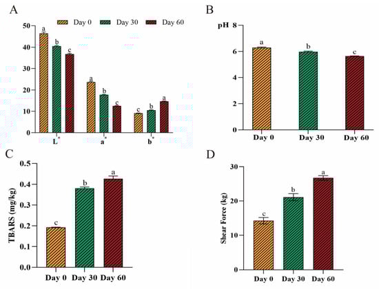 pH is an important factor for evaluating meat quality. The pH of the beef bottom round samples exhibited a 5.24 decrease on day 30 and a 10.39 decrease on day 60 during the frozen storage period, compared to day 0, as shown in Figure 1B. This is because during the frozen storage period, the concentration and composition of salt could change the pH and then impact the reactivity of proteins and enzyme activity []. Due to the frozen treatment, a large quantity of H+ is released during the protein denaturation process throughout the storage period; this is the major cause of the pH decline. Moreover, glycogenolysis, the loss of water and soluble matter, and the production of acidoids are caused by the freezing process [,]. The pH on day 30 was significantly lower than on day 0; this was because of the aging of the beef. During this process, the muscle glycogen and ATP could produce lactic acid, phosphoric acid, and creatine, which led to the decline of pH [].