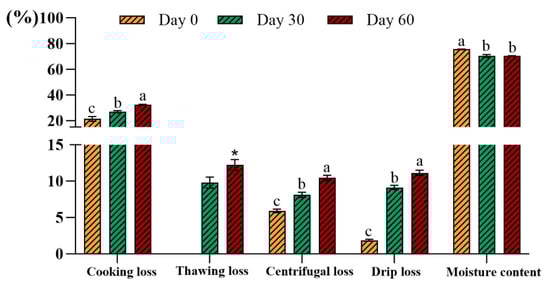 The ability of beef bottom round samples to retain their inherent water (WHC) even when water is added during processing is a measure of their quality. As shown in Figure 2, compared to the day 0 sample, the cooking loss showed a 26.22 percentage point increase and a 32.43 percentage point increase on day 30 and day 60. And, the thawing loss exhibited a 24.73 percentage point increase on day 60, compared to day 30. As for the centrifugal loss, this showed a 37.40 percentage point increase on day 30 and a 76.57 percentage point increase on day 60. In addition, compared to day 0, the drip loss increased by about 4-fold and about 5-fold on day 30 and day 60, respectively. Remarkably, the moisture content of the beef bottom round samples showed a 7.0 percentage point decrease after 30 days, but no significant difference between the moisture contents of day 30 and day 60. The results in our study agreed with the findings of Yuqian Xu []. The decline in the beef bottom round samples’ water-holding capacity may be attributed to several reasons: First, the oxidation of sulfhydryl groups or disulfides form disulfide bonds, which causes protein aggregation and thus reduces the solubility of proteins []. Second, the increase in intracellular ionic strength causes protein denaturation, causing myofibrillar proteins to lose their water retention and thus release exudate or free water [].