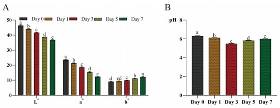This study also checked the impact of refrigeration (4 °C) temperature on the beef bottom round samples’ color and pH over seven days. Figure 3A shows that the L* and a* values significantly declined towards the 7th day of storage at 4 °C (p < 0.05); the L* value of the beef’s surface color showed a 20.69 percentage point decrease on day 7, compared to day 0, and the a* value exhibited a 47.75 percentage point decrease on day 7, compared to day 0. The surface color depends on the myoglobin, hemoglobin, and tiny amounts of colored metabolites. However, combined with oxygen, hemoglobin, and myoglobin, it transforms into oxyhemoglobin and oxymyoglobin, which thereafter will change to metmyoglobin, appearing deep red in color []. Conversely, the beef samples’ b* values showed a 35.23 percentage point increase on day 7, compared to day 0. This illustrates that the surface color of beef gradually changes to yellow as storage progresses. This discoloration results from lipid oxidation—beef bottom round samples’ exposure to oxygen leads to the oxidation of phospholipids and neutral lipids [].