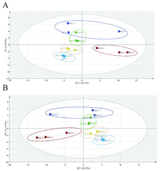 The PCA Score (A) and PLS-DA score (B) of the volatile profile of beef stored at 4 °C for one week (n = 3).
