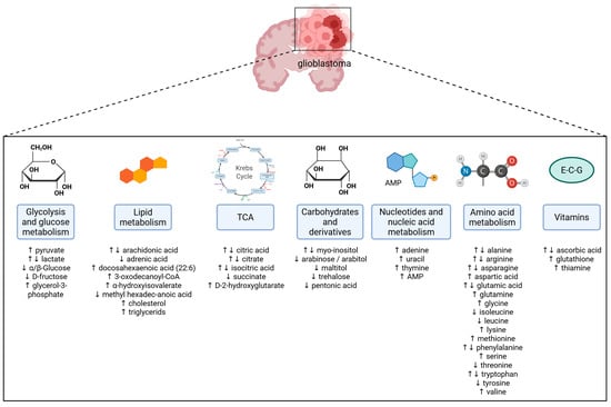 Alterations in specific metabolites in glioblastoma. ↑ denotes increased levels and ↓ denotes decreased levels of a specific metabolite. For more detailed information, please refer to Table 1, Table 2, Table 3 and Table 4. Created in BioRender. Videtič Paska, A. (2025) https://BioRender.com/lt41n2m.