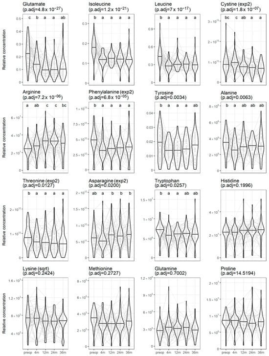Changes in circulating amino acids up to 36 months after bariatric surgery. Circulating amino acids were compared across time points using a mixed model with time as a fixed parameter and individuals as a random parameter. Letters express the results of the Tukey HSD post hoc test; different letters mean that the time points were significantly different. The variables were transformed when needed to comply with the test assumptions. The concentration of amino acids is expressed in relative values. The violin plots show the distribution of circulating amino acids at each time point; the middle lines correspond to the median and the grey points and lines are individual observations. The p-values were adjusted using Bonferroni’s correction.